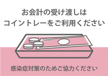 受付での会計時は、金銭はトレー上で受け渡しをさせていただいております。 定期的な換気