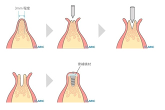 インプラントを埋入できる位にまで押し広げてから、インプラントを埋入します。ただし、下顎の骨等、骨が硬い場合には、応用が困難な場合もあります。