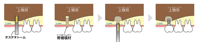 上顎臼歯部歯槽頂から上顎洞までの骨が極度に薄い時に、お口の中から上顎洞前壁の骨に窓を開け、そこに骨を追加して骨を増やす方法です。