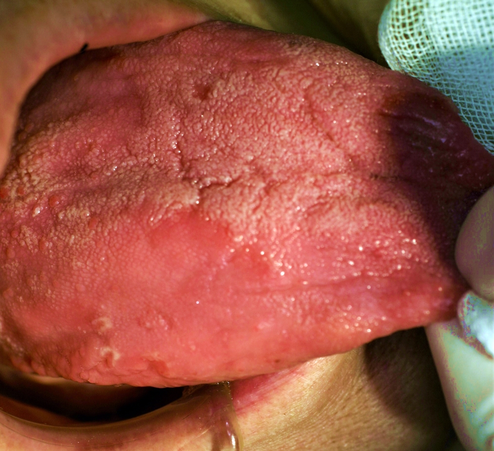 Candida albicansを主とする真菌(カビ)感染症で、口腔粘膜に白色病変として生じる白板症や扁平苔癬と異なり、白色の偽膜が擦過することで剥離出来ます。舌、頬粘膜に好発し、原因は唾液分泌低下、清掃不良、抗生物質による菌交代現象、全身状態の悪化などです。