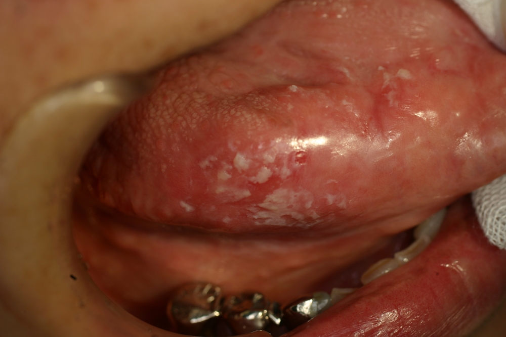 発赤、ビラン、潰瘍を併うレース状、網状の白色病変で原因不明の難治性慢性炎症性疾患です。好発部位は頬粘膜、舌、歯周で無症状で推移するものがありますが、0.4〜5.3%の頻度で、悪性化の報告があります。