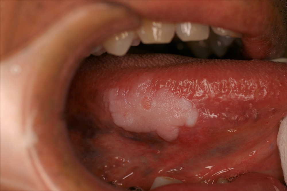 WHOの診断基準では、口腔粘膜に生じた摩擦によって、除去出来ない白色の板状、または斑状の病変で、他の疾患に分類出来ないものと定義されている。均一型と不均一型があり、均一型で3%、不均一型で20%の頻度で悪性化の報告があり、経過観察に注意が必要になります。